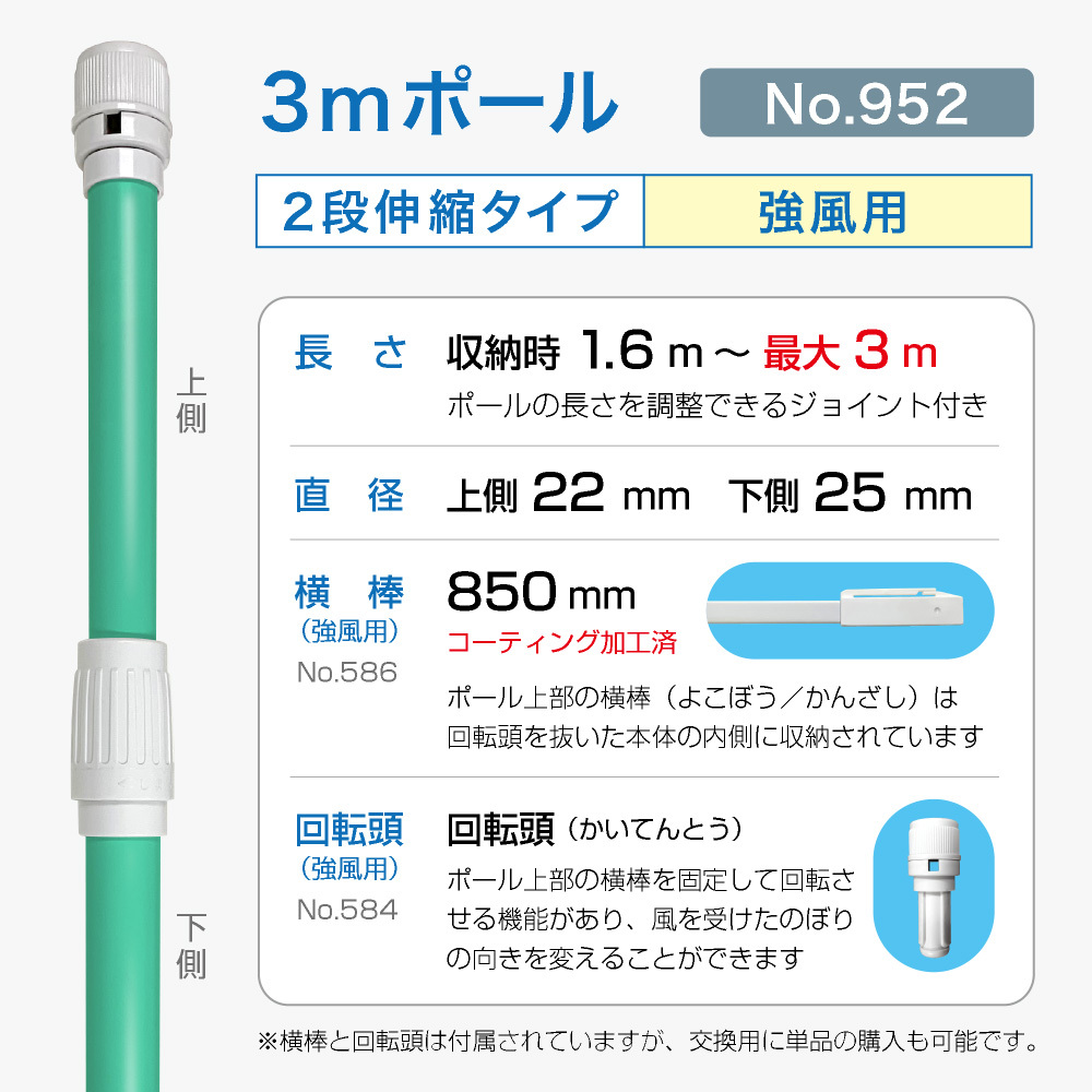 のぼり旗 ポール 3m 強風用 2段伸縮 緑色 横棒850mm コーティング No.952 [952]